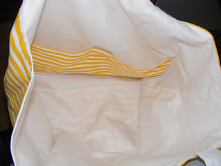 Em tempo de férias (as que já passaram, claro), a minha cunhada pediu-me uma mala para levar duas toalhas de praia, de adulto e onde coubesse mais alguma coisinha. Tinha cá em casa um tecido do IKEA que comprei a 2€ / metro (grande saldo). Para além de achar que o tecido é giríssimo, tem qualquer coisa nele que grita verão (talvez seja o amarelo!!). Foi a segunda tentativa de fazer algo parecido com uma mala e desta vez consegui fazer um saco enorme (por oposição à micro mala que fiz para mim...)