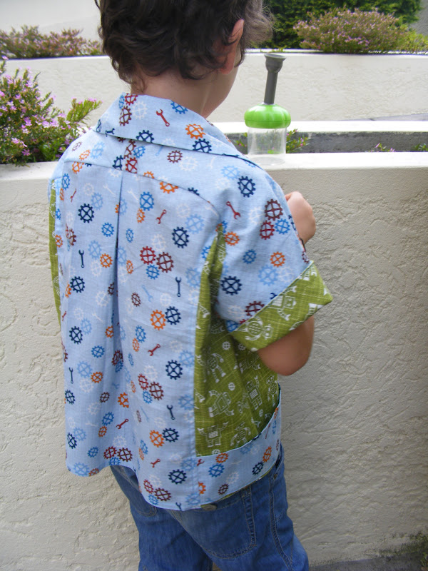 the older boy I used a size 6/7 which is ok in length, althoug it is a little wide! As the shirt had so many pieces I didn't dare try to change the pattern. Given the retro inspired vibe the shirt has, I think that is not that bad, the worst is around the neck.. Maybe I have to add another button closer the collar. I used fabrics from the collection of Caleb Grey Robot Factory for Robert Kaufman. I already used the orange version of this pattern in May sew along. Now I chose the green with white robots combined with the gears in blue. The shirt turned out quite discreet which made me very happy. I like it, how about you?
